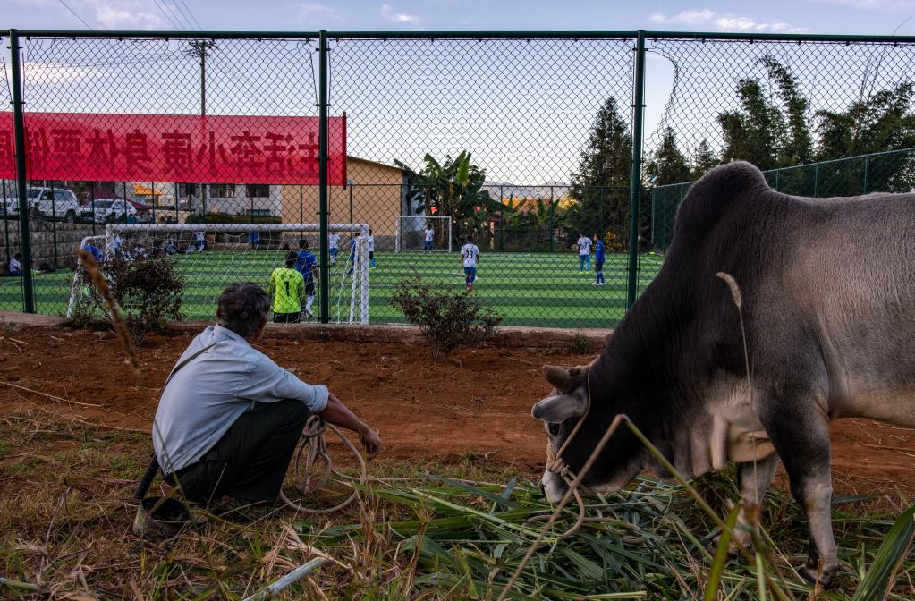 云南省滄源佤族自治縣龍乃村首任足球隊隊長(cháng)鮑志昆在場(chǎng)邊看隊員們踢球。