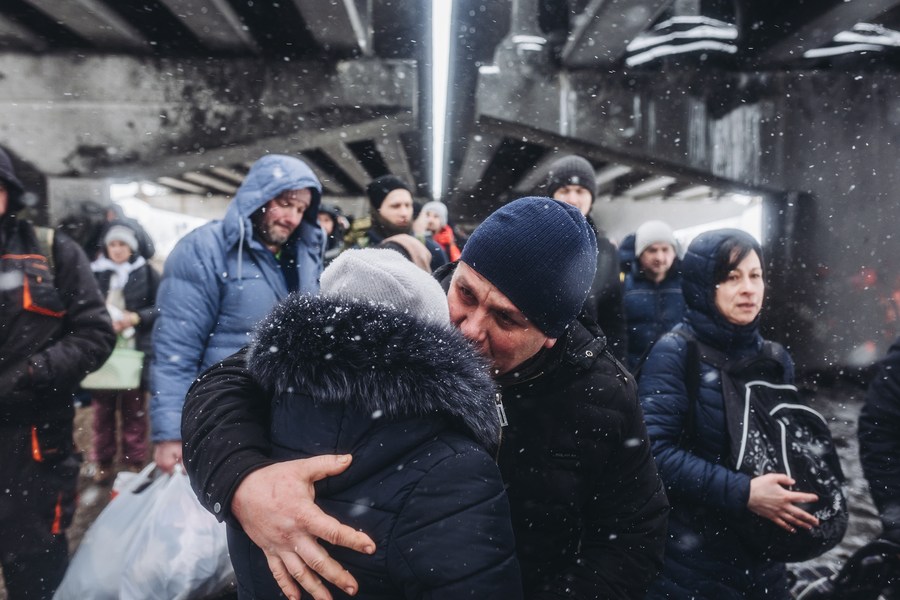 2022年3月8日,一對情侶在烏克蘭伊爾平告別。(新華社發(fā),迭戈·埃雷拉攝)