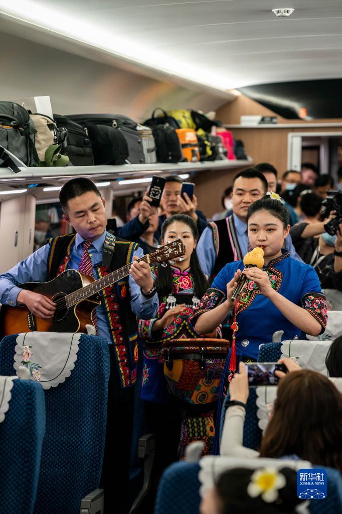 4月13日,乘坐首發(fā)列車(chē)的旅客在車(chē)上欣賞歌舞表演。新華社記者 胡超 攝