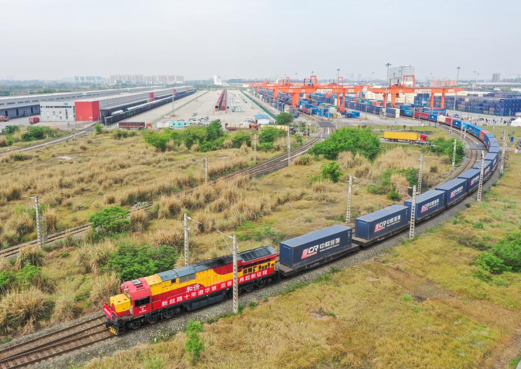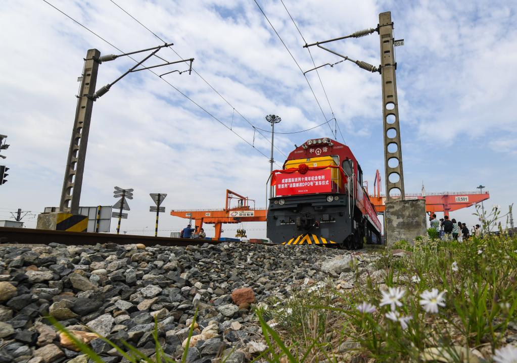 4月26日,“法國郵政DPD號”中歐班列從成都國際鐵路港駛出。新華社記者王曦 攝