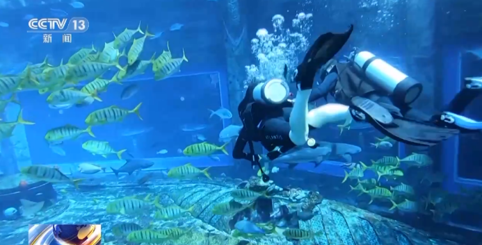 在水族館里體驗潛水的游客