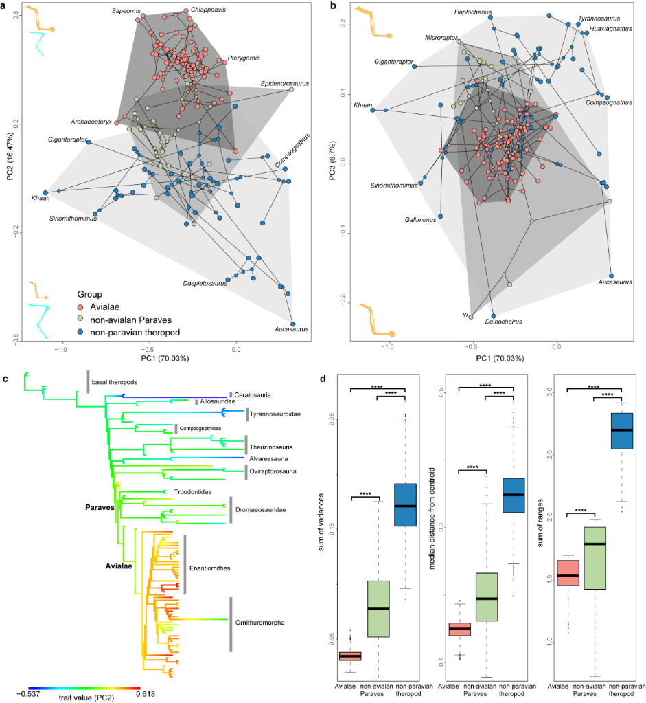 包括鳥(niǎo)類(lèi)在內的中生代獸腳類(lèi)恐龍肢骨形態(tài)演化空間和多樣性的比較。(中科院古脊椎所供圖)
