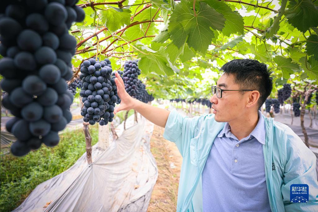 6月8日,江北區農業(yè)農村局的農技專(zhuān)家王劍在大棚內查看葡萄的生長(cháng)情況。