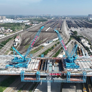 襄陽(yáng)北編組站大橋為雙獨塔雙索面混合梁斜拉橋,主橋長(cháng)920米,寬37.5米,共跨越32股鐵路線(xiàn),是國內跨越鐵路股道最多的混合梁斜拉橋。