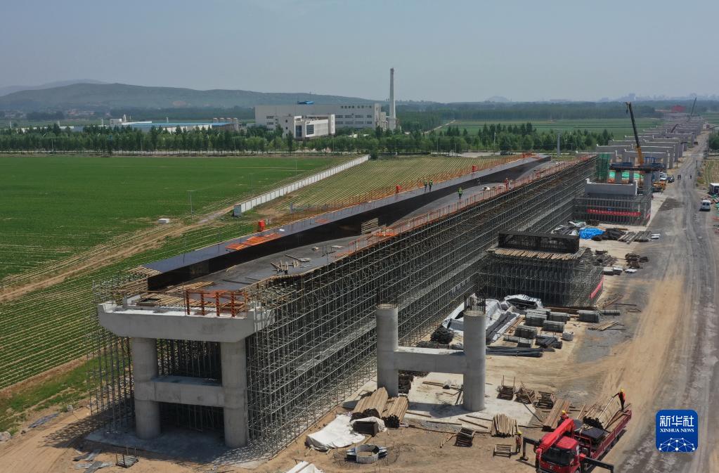 6月8日,工人在河北省昌黎縣境內的秦唐高速三標段建設工地施工(無(wú)人機照片)。
