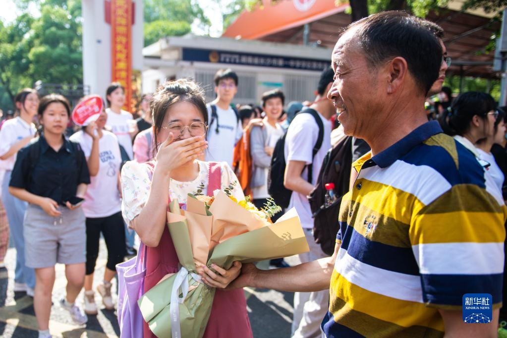 6月9日,在長(cháng)沙市第一中學(xué)考點(diǎn),一名家長(cháng)迎接考生走出考場(chǎng)。