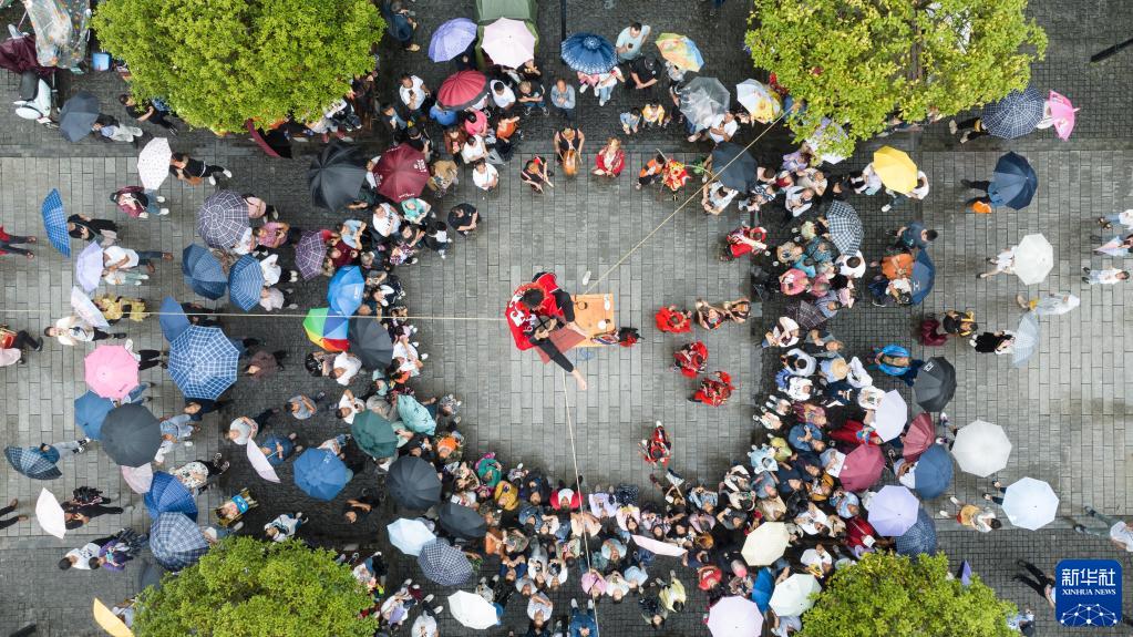 6月22日,在重慶市秀山土家族苗族自治縣洪安古鎮,游客在老街觀(guān)看儺戲表演(無(wú)人機照片)。