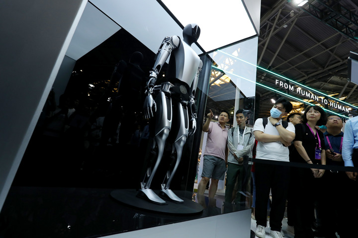 7月6日,參觀(guān)者在一個(gè)進(jìn)行靜態(tài)展示的特斯拉機器人旁駐足觀(guān)看。新華社記者 方喆 攝