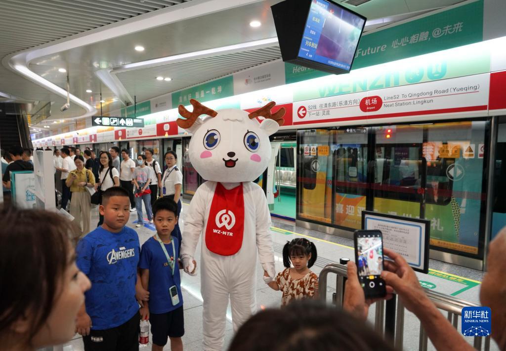 8月26日,在溫州S2線(xiàn)機場(chǎng)站,乘客在與吉祥物合影。新華社發(fā)(蘇巧將 攝)