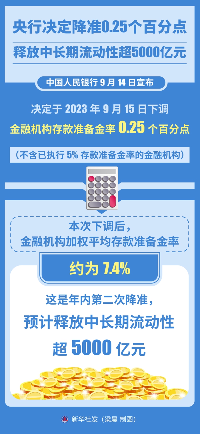 新華社北京9月14日電(記者吳雨)中國人民銀行14日宣布,決定于2023年9月15日下調金融機構存款準備金率0.25個(gè)百分點(diǎn)(不含已執行5%存款準備金率的金融機構)。本次下調后,金融機構加權平均存款準備金率約為7.4%。