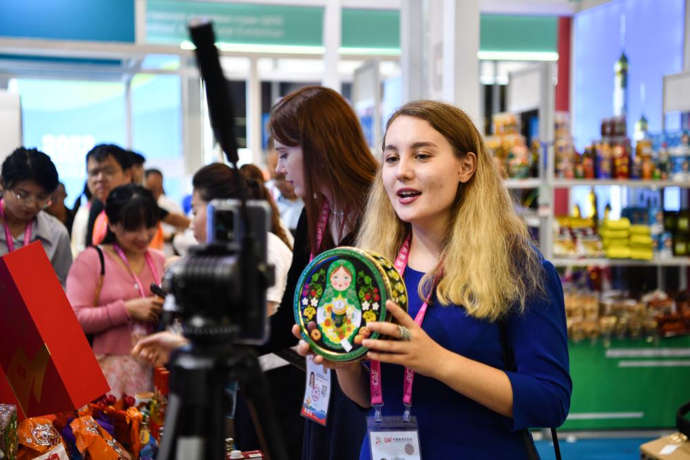 9月19日,外國參展商在楊凌農高會(huì )展臺進(jìn)行直播。新華社記者 張博文 攝