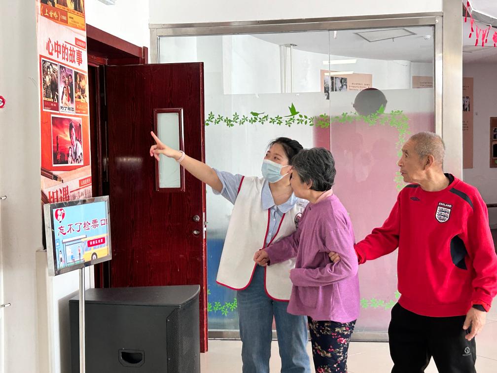 2023年5月3日,醫務(wù)社工在“忘不了電影院”給認知癥老人推薦電影。