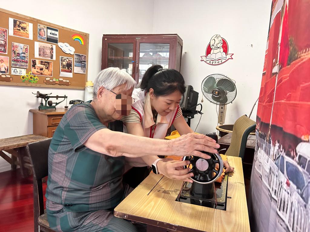 2023年8月7日,在“忘不了懷舊角”,醫務(wù)社工協(xié)助認知癥患者使用縫紉機。