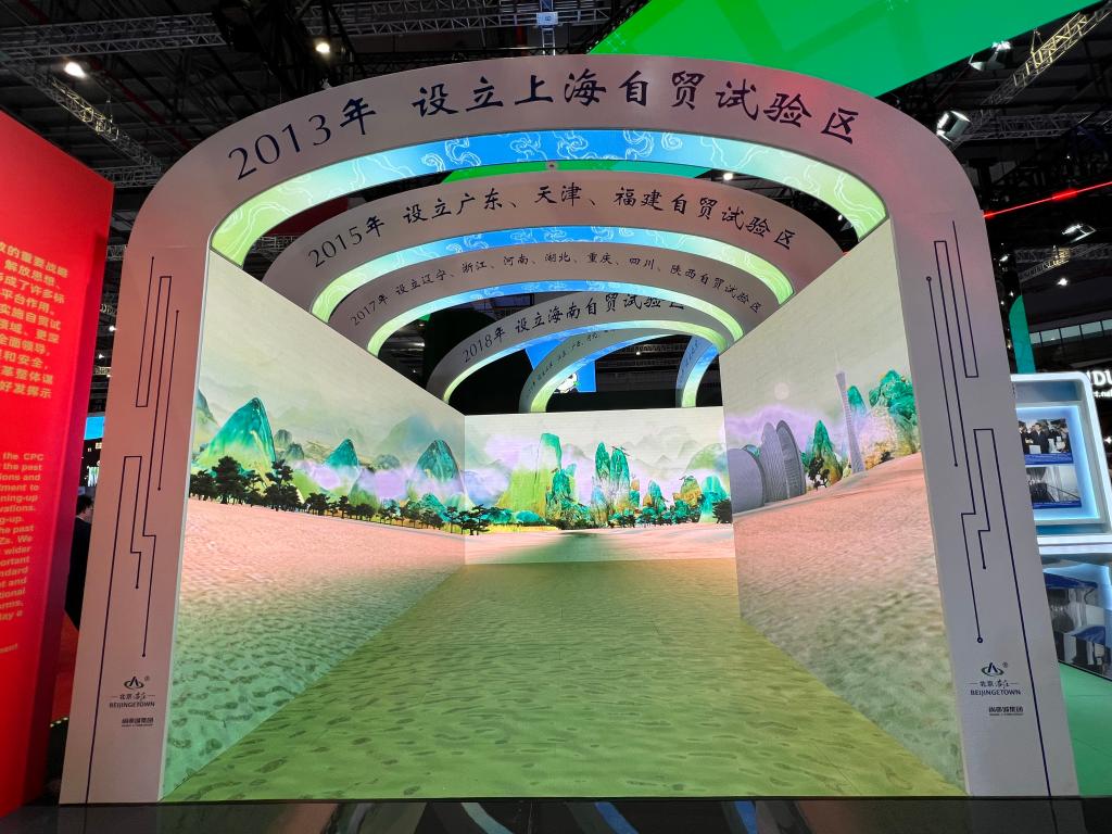 這是正在國家會(huì )展中心(上海)舉辦的第六屆中國國際進(jìn)口博覽會(huì )國家綜合展的一個(gè)特別部分“中國式現代化的重要探索和實(shí)踐——自由貿易試驗區建設十年成就展”。它位于中國國家館內,通過(guò)高清視頻、珍貴照片、實(shí)物模型等,講述中國各地自貿試驗區建設的改革開(kāi)放故事。