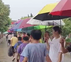 在大連莊河市,大雨傾盆而下,考生即將進(jìn)入考場(chǎng),民警、老師、考點(diǎn)工作人員自發(fā)撐起了30米長(cháng)的“斜式傘橋”?!皹颉钡囊欢诉B著(zhù)送考校車(chē),另一端連著(zhù)考點(diǎn)教學(xué)樓大門(mén);雨傘齊刷刷地向考生傾斜,撐傘者的后背卻“泡”在了雨水里。有網(wǎng)友留言說(shuō),“這是愛(ài)在‘傘傘’發(fā)光!”