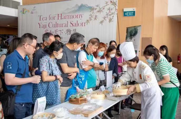 在新加坡中國文化中心舉辦的雅集活動(dòng)上,江蘇青年作家為觀(guān)眾作《跟著(zhù)茶香游江蘇》主題講座,介紹了《紅樓夢(mèng)》里茶的故事,觀(guān)眾們還在現場(chǎng)品嘗到了聞名世界的富春茶點(diǎn)。