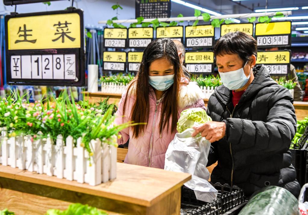 1月18日,居民在廣西興業(yè)縣“老鄉家園”配套建設的平價(jià)超市內購買(mǎi)蔬菜。新華社記者 曹祎銘 攝