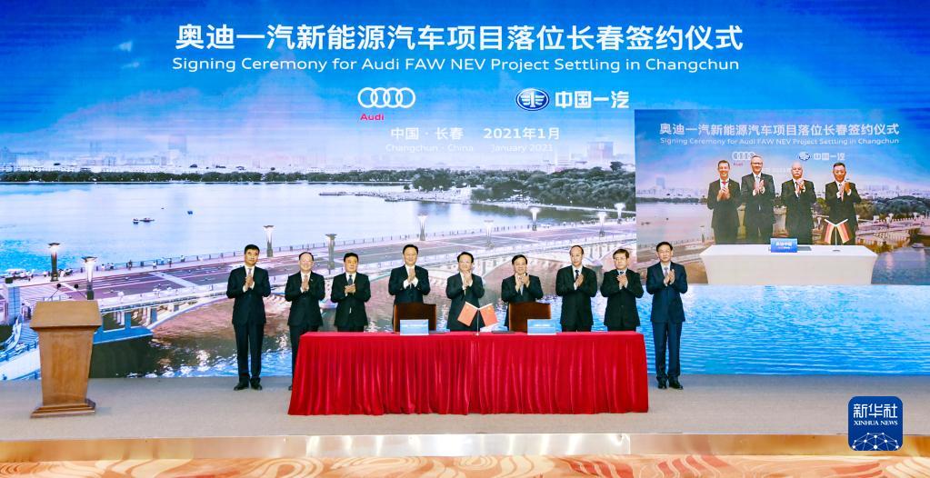 2021年1月18日,中國一汽、德國奧迪公司、長(cháng)春市政府以視頻連線(xiàn)方式簽署三方協(xié)議,宣布一汽奧迪新能源汽車(chē)項目落戶(hù)長(cháng)春。新華社發(fā)