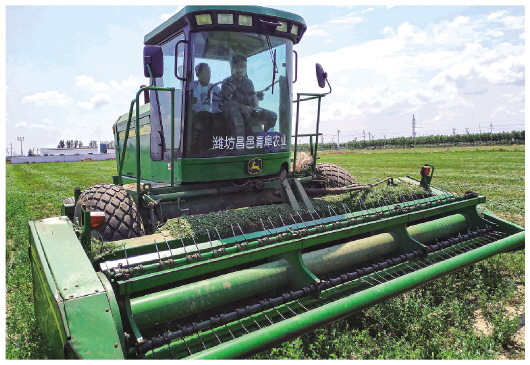 ▲2021年8月18日,青阜農業(yè)綜合體的員工正在用進(jìn)口農機收割苜蓿。 受訪(fǎng)者供圖