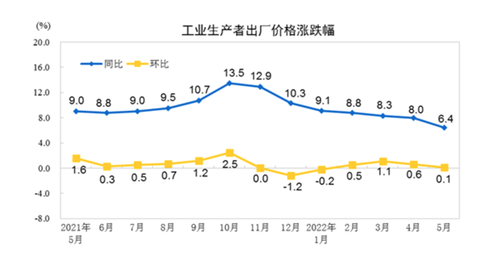 從全國工業(yè)生產(chǎn)者出廠(chǎng)價(jià)格指數(PPI)看,隨著(zhù)各地區各部門(mén)高效統籌疫情防控和經(jīng)濟社會(huì )發(fā)展,保障重點(diǎn)產(chǎn)業(yè)鏈供應鏈暢通穩定,5月份PPI同比上漲6.4%,漲幅比上月回落1.6個(gè)百分點(diǎn)。