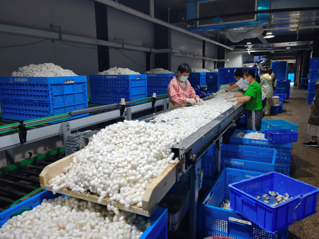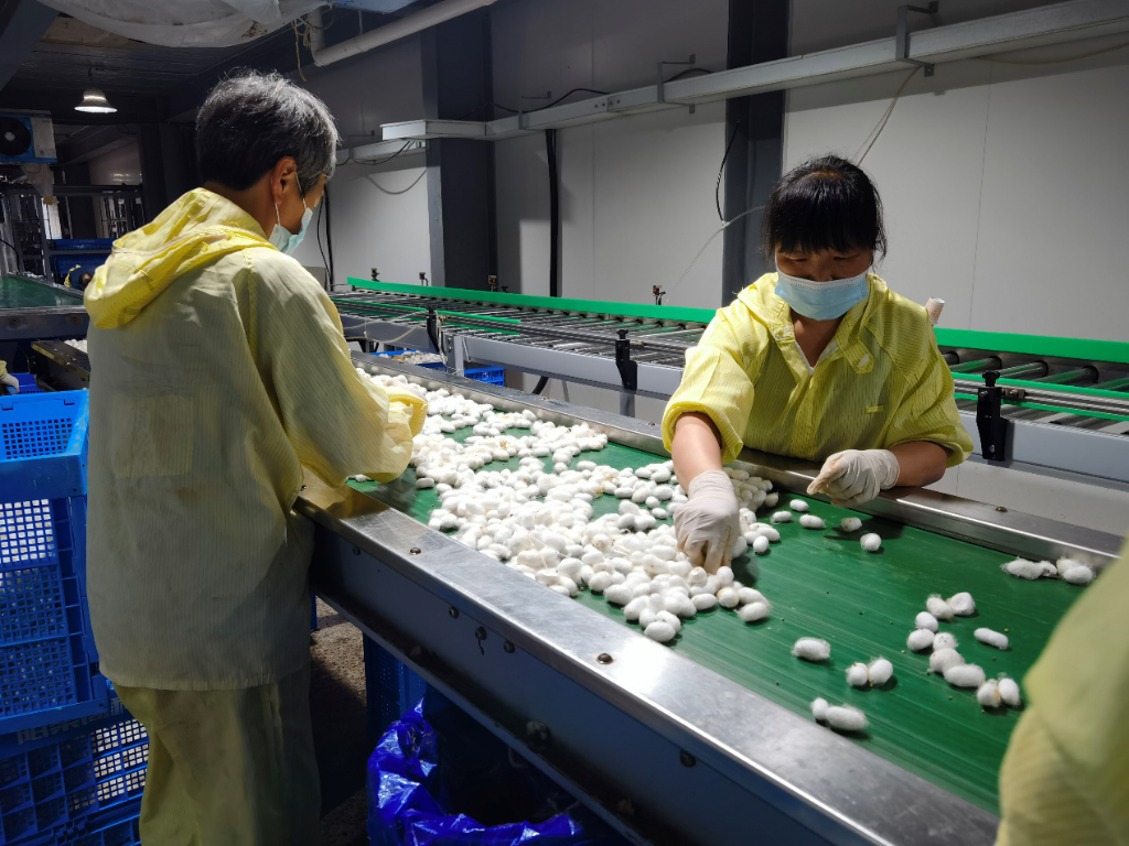 生產(chǎn)車(chē)間里,巴貝集團員工正在挑揀蠶繭。新華社記者 殷曉圣 攝