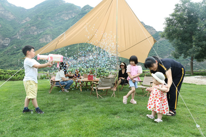 7月2日,游客在河北省保定市淶水縣的野三坡景區露營(yíng)基地休閑玩耍。新華社記者 高博 攝
