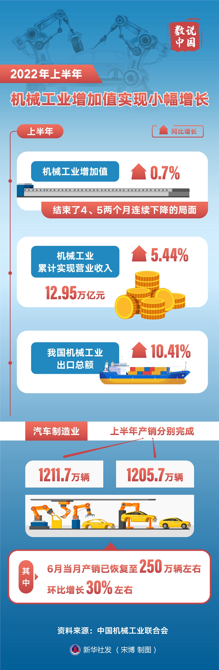 新華社北京8月9日電(記者張辛欣)記者9日從中國機械工業(yè)聯(lián)合會(huì )獲悉,上半年機械工業(yè)增加值同比增長(cháng)0.7%,結束了4、5兩個(gè)月連續下降的局面。其中,汽車(chē)制造業(yè)快速擺脫疫情影響,上半年產(chǎn)銷(xiāo)分別完成1211.7萬(wàn)輛和1205.7萬(wàn)輛。