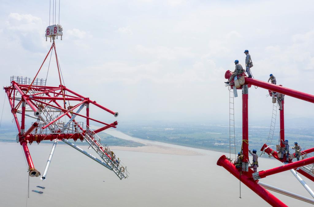 8月16日,“西電東送”重點(diǎn)工程白鶴灘—浙江±800千伏特高壓直流輸電線(xiàn)路工程安徽段長(cháng)江跨越塔全部組立完成。