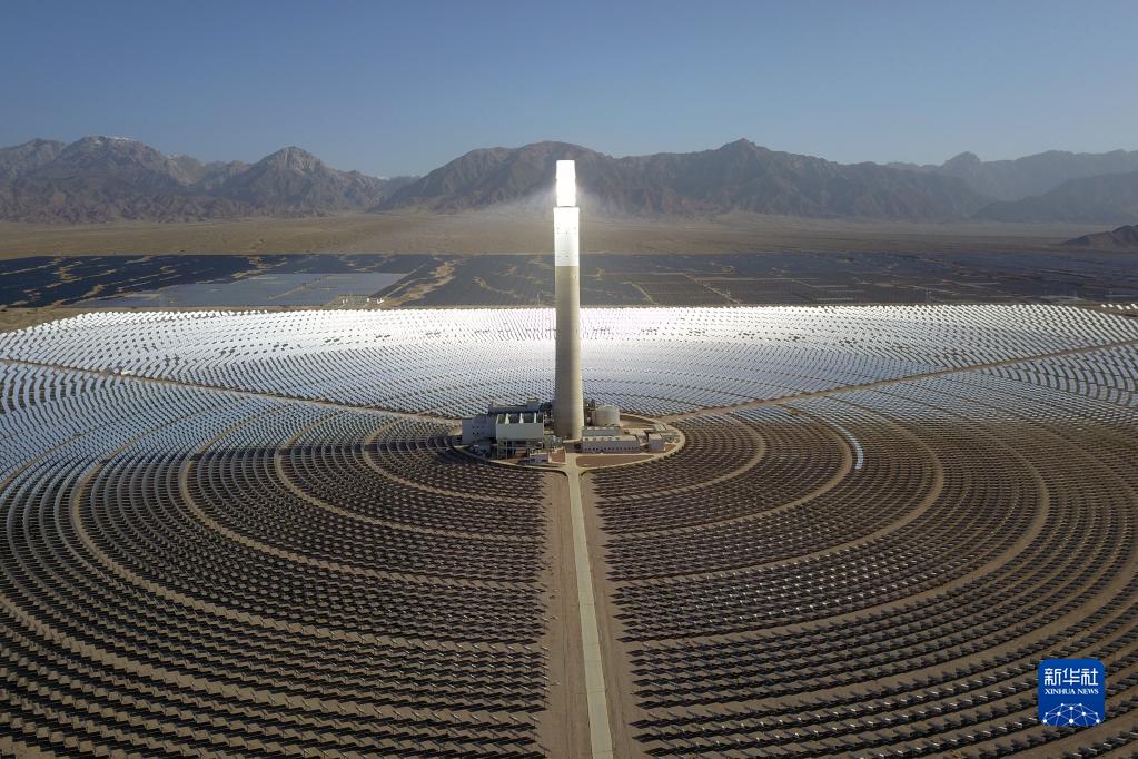 這是2022年6月8日在海西蒙古族藏族自治州德令哈市光伏(光熱)產(chǎn)業(yè)園拍攝的青海中控德令哈50兆瓦光熱電站(無(wú)人機照片)。新華社記者 范培珅 攝