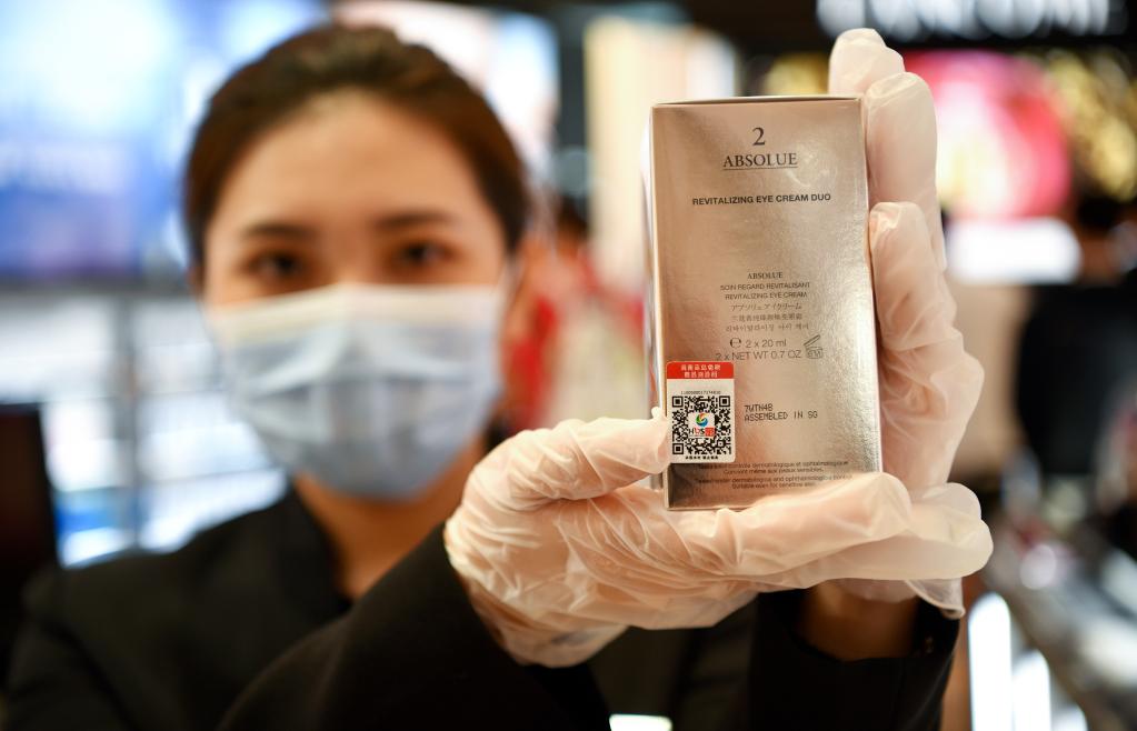 圖為??谌赵聫V場(chǎng)免稅店工作人員展示加貼溯源碼的香化商品。新華社記者郭程 攝