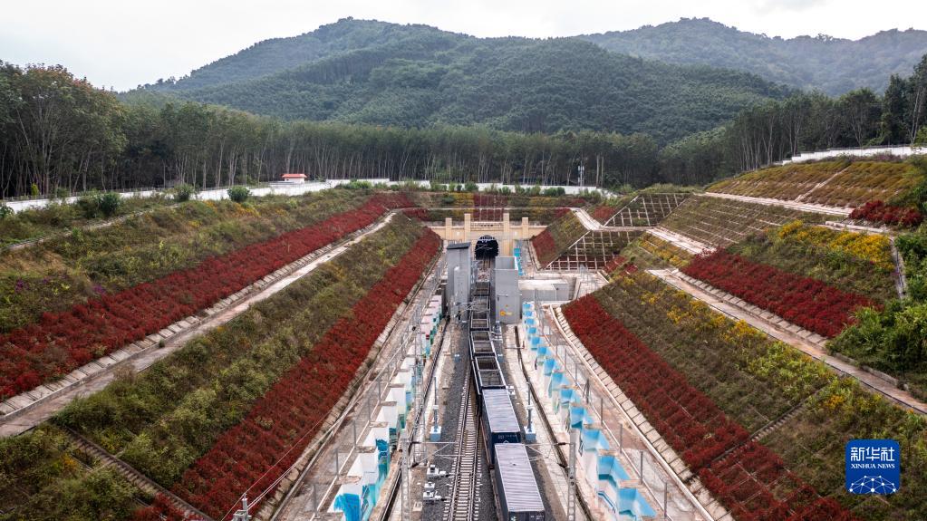 貨物列車(chē)即將駛入位于中老邊境的友誼隧道(2022年11月24日攝,無(wú)人機照片)。新華社記者 胡超 攝
