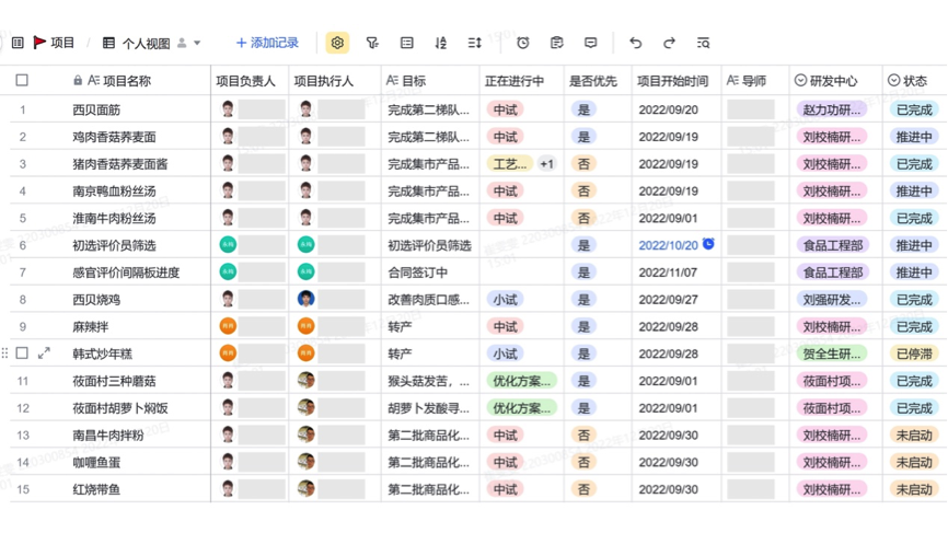 “莜面魚(yú)魚(yú)”“莜面村三種蘑菇”“胡蘿卜燜飯”……只見(jiàn)數百個(gè)產(chǎn)品研發(fā)項目在多維表格里清晰排列,項目負責人、完成進(jìn)度、優(yōu)先級一目了然。