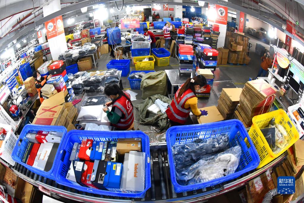 工人在江蘇省連云港市海州區天馬電商產(chǎn)業(yè)園按照訂單分揀貨品(2022年11月11日攝)。新華社發(fā)(耿玉和 攝)