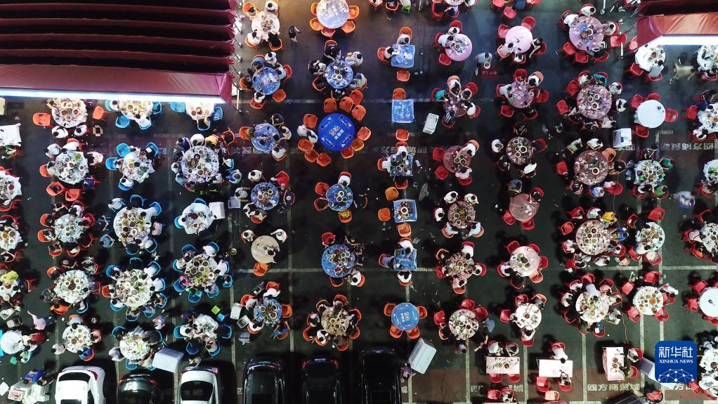 游客在湖南長(cháng)沙四方坪夜市就餐(2022年7月29日攝,無(wú)人機照片)。新華社記者 陳振海 攝