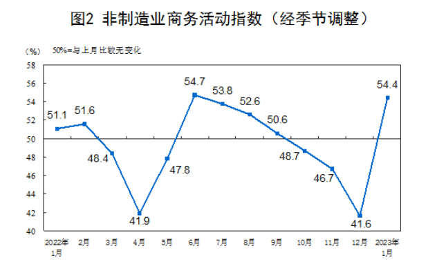 1月份,非制造業(yè)商務(wù)活動(dòng)指數為54.4%,比上月上升12.8個(gè)百分點(diǎn),重返擴張區間,非制造業(yè)景氣水平觸底回升。