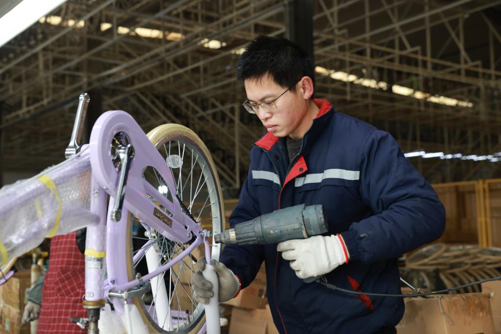 萬(wàn)怡自行車(chē)廣宗有限公司車(chē)間里,工人正在組裝自行車(chē)。新華社記者齊雷杰 攝