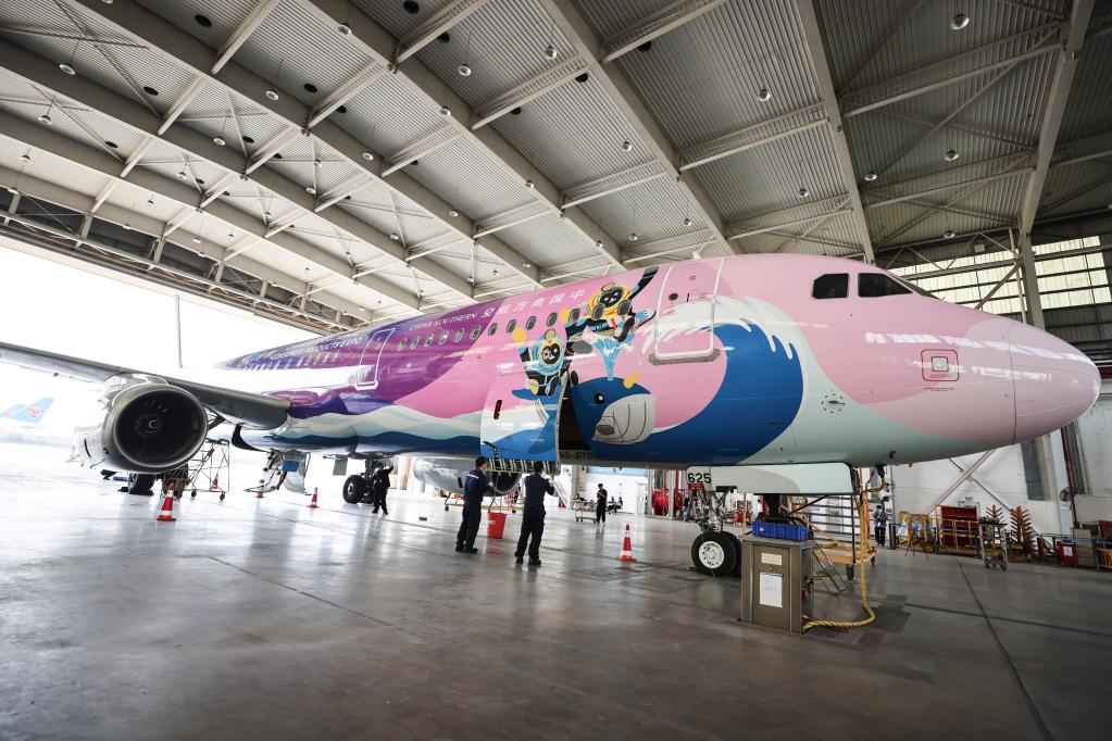 2023年3月7日,在??诿捞m國際機場(chǎng),南航機務(wù)人員對“消博號”彩繪飛機進(jìn)行深度檢查。新華社記者 張麗蕓 攝