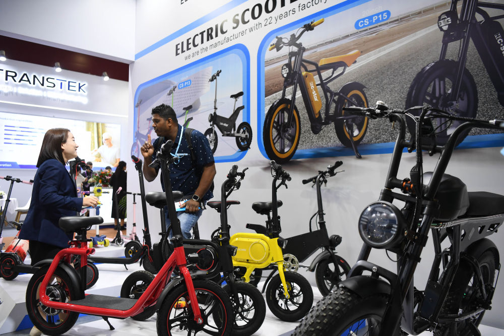 4月15日,采購商(右)和電動(dòng)自行車(chē)參展商在廣交會(huì )上交流。新華社記者 鄧華 攝