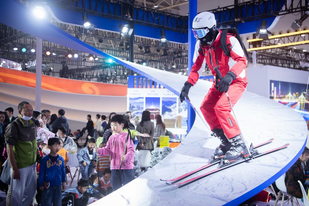 冰雪運動(dòng)、山地索道、攀巖等玩法也紛紛亮相。遼寧館的旋轉雪道上,游客們握著(zhù)雪杖、踩著(zhù)滑雪板,競相拍照打卡。湖北恩施等南方城市的冰雪資源也逐漸“盤(pán)活”,帶著(zhù)最新、最潮的裝備來(lái)參展。