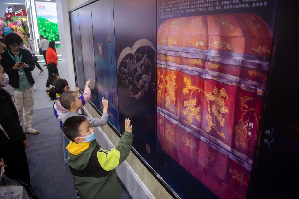 甘肅館“我在敦煌畫(huà)壁畫(huà)”數字虛擬體驗活動(dòng)現場(chǎng)圍滿(mǎn)了小朋友。5歲的張孟石在電子屏上選擇壁畫(huà)線(xiàn)稿,用朱紅、佛手黃、落英淡粉等巖彩進(jìn)行填充。瞬間,一幅《雙鴿紋》壁畫(huà)便從遙遠的莫高窟“走”出來(lái),躍上電子屏“活”了起來(lái)?!暗谝淮螄L試‘畫(huà)’壁畫(huà),覺(jué)得很好看、很好玩!更想去敦煌莫高窟旅游了?!睆埫鲜癫娠w揚地說(shuō)。