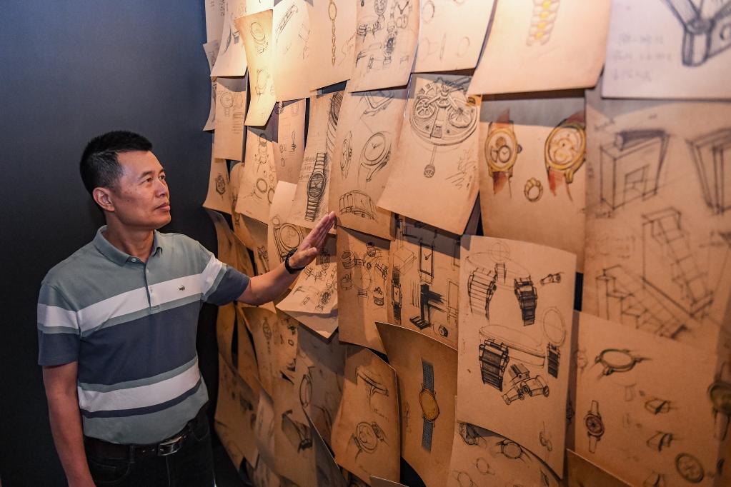 高級鐘表維修技師劉中華介紹飛亞達手表的設計手稿。新華社記者毛思倩攝