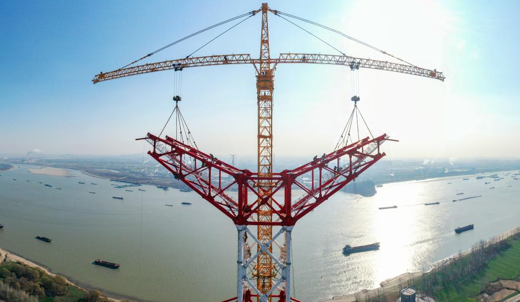 2021年12月26日,安徽送變電工程有限公司施工人員在長(cháng)江大跨越輸電鋼管塔封頂施工現場(chǎng)作業(yè)(無(wú)人機照片)。