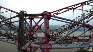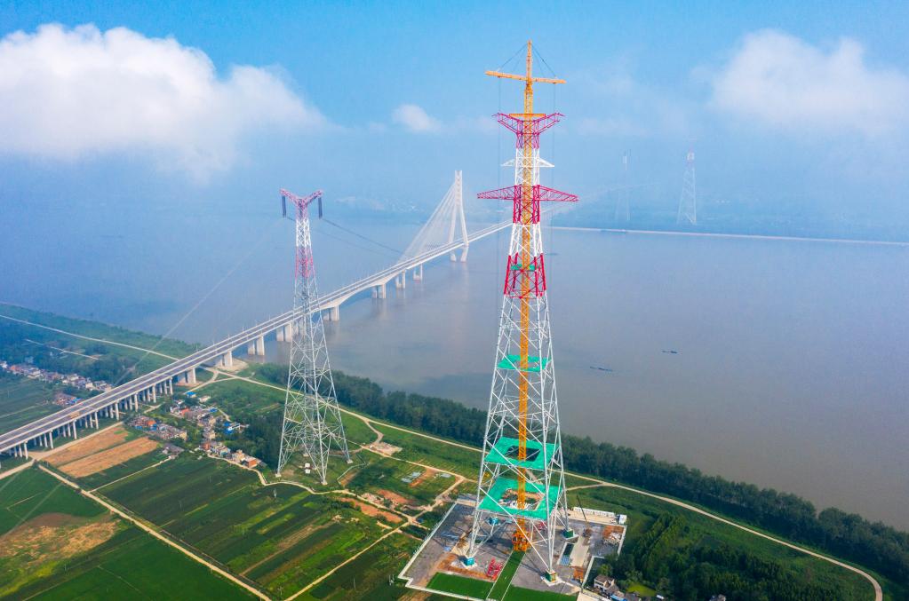 2022年8月1日,安徽送變電工程有限公司施工人員在池州長(cháng)江大跨越南岸跨越塔封頂施工現場(chǎng)作業(yè)(無(wú)人機照片)。
