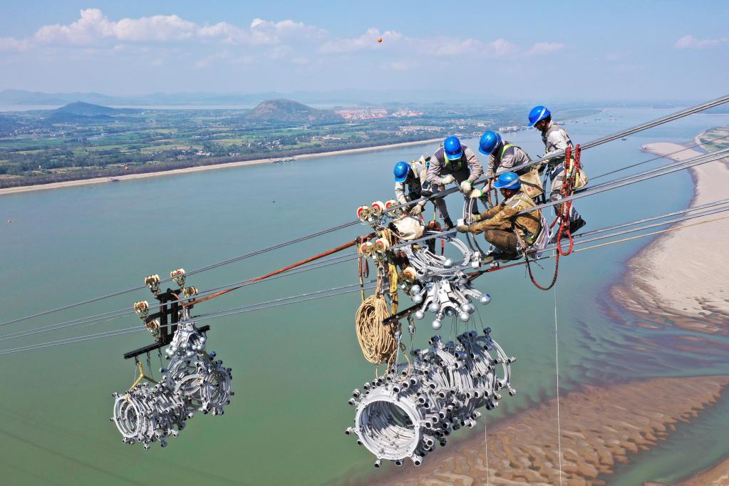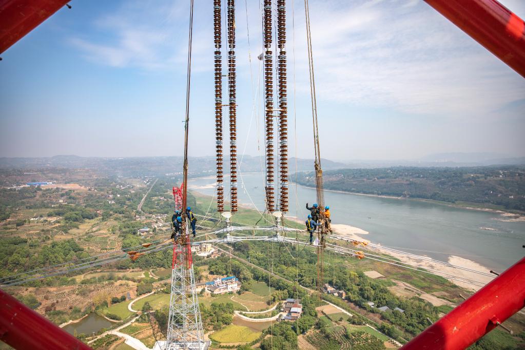 2022年9月19日,工人在白鶴灘至浙江±800千伏特高壓直流輸電工程(白浙線(xiàn))湖北省宜昌市秭歸縣沙鎮溪鎮長(cháng)江大跨越現場(chǎng)施工(無(wú)人機照片)。