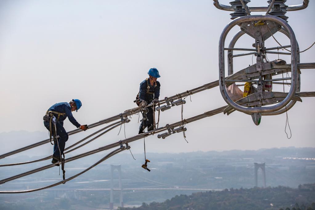 2022年9月13日,工人在白鶴灘-浙江±800千伏特高壓直流輸電線(xiàn)路工程(重慶段)江津長(cháng)江大跨越施工現場(chǎng)作業(yè)。