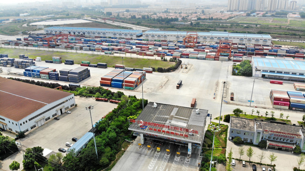俯瞰上合示范區多式聯(lián)運中心(6月1日攝,無(wú)人機照片)。新華社記者 李紫恒 攝