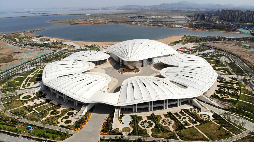 位于中國—上海合作組織地方經(jīng)貿合作示范區的青島·上合之珠國際博覽中心(5月22日攝,無(wú)人機照片)。新華社記者 李紫恒 攝