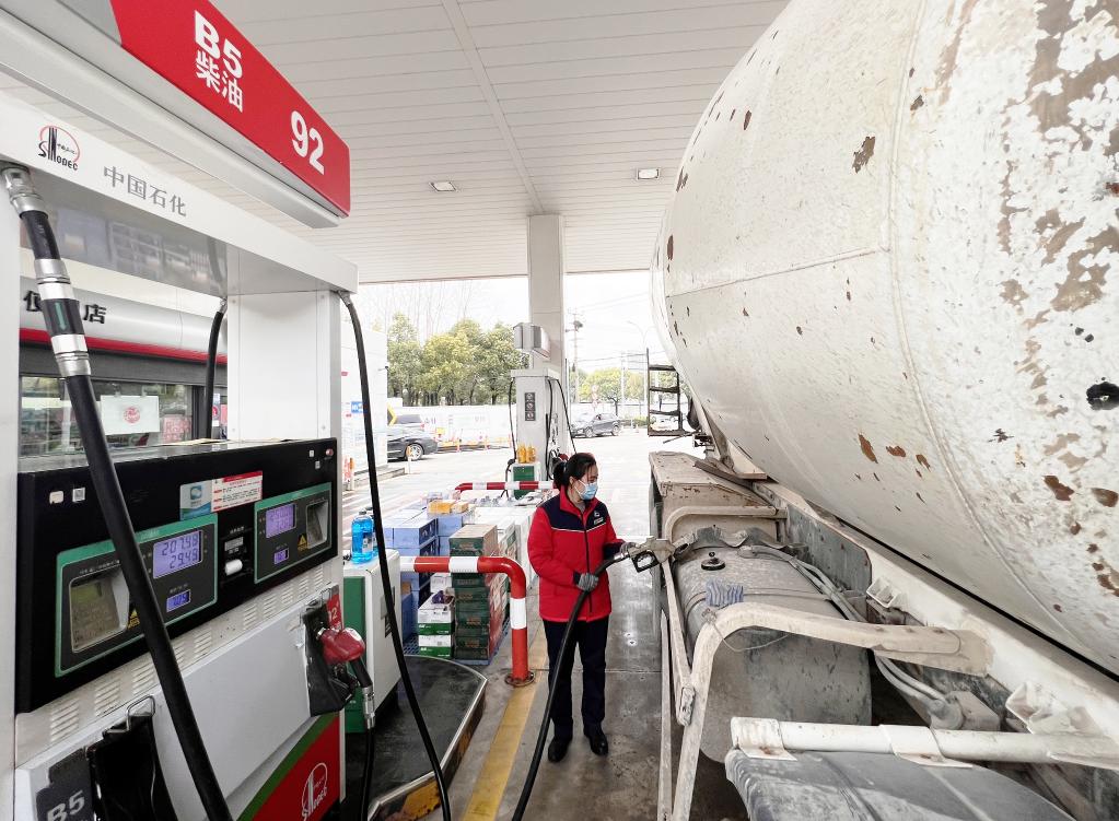 中石化加油站中工作人員正在給車(chē)輛加注B5生物柴油。受訪(fǎng)單位供圖