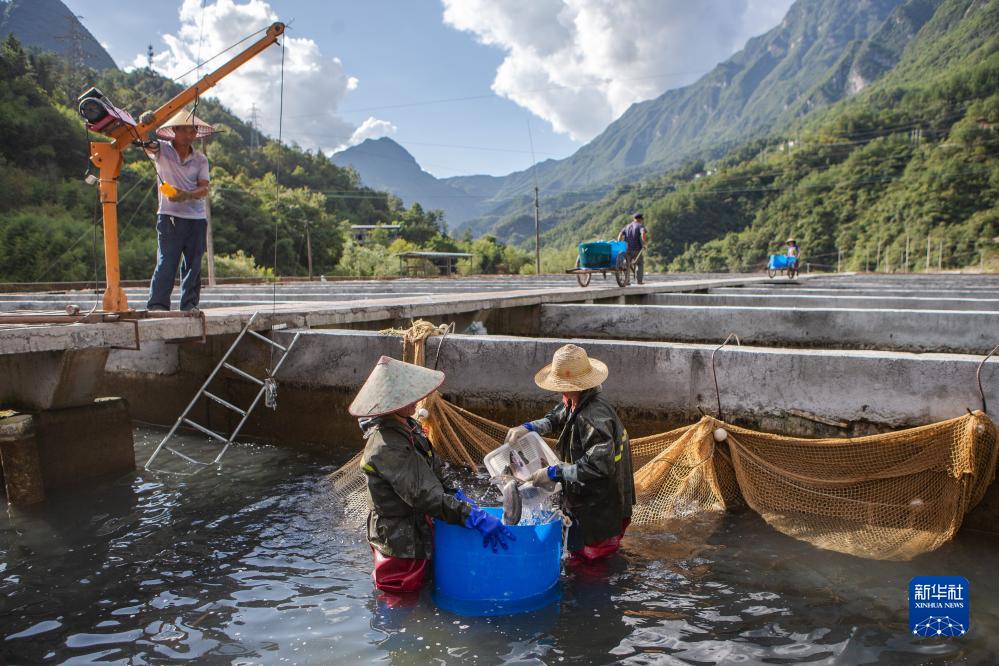 9月13日,在重慶市城口縣蓼子鄉明安村虹鱒魚(yú)養殖基地,工作人員在分選虹鱒魚(yú)。新華社記者 儲加音 攝