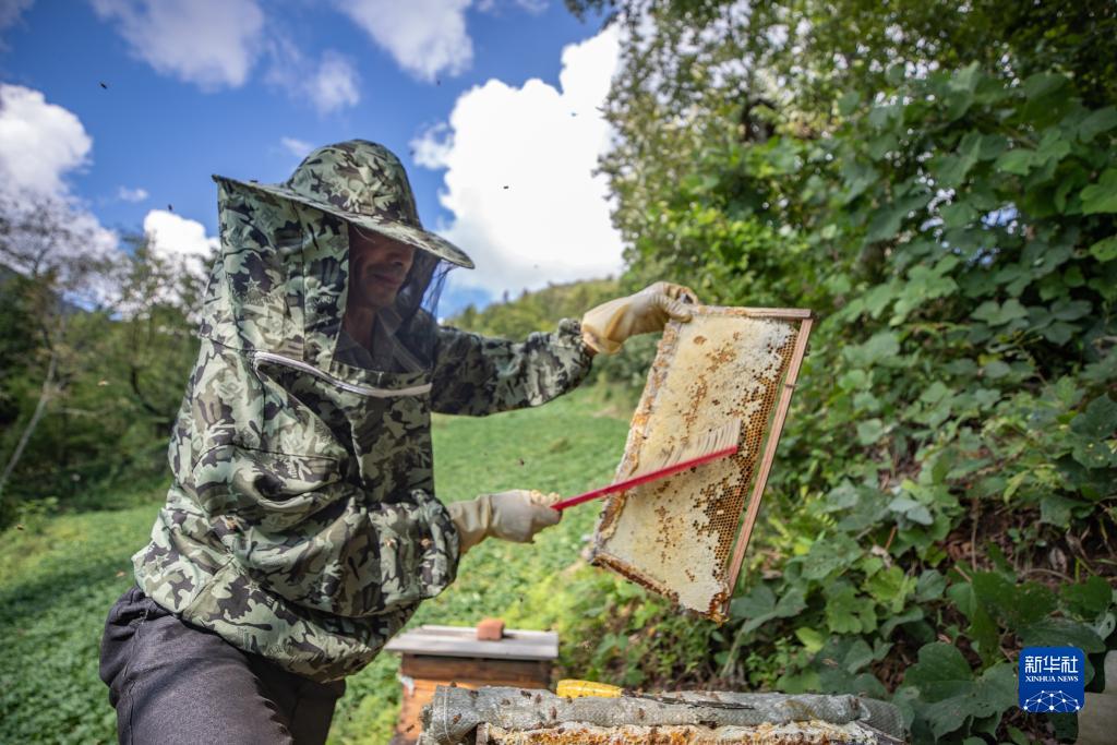 9月13日,在重慶市城口縣巴山鎮農民村,蜂農在采收蜂蜜。新華社記者 黃偉 攝